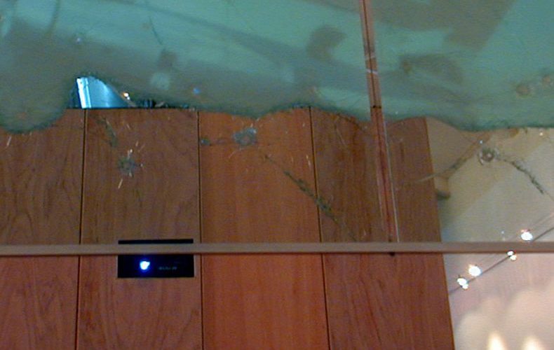 The Ninth Grader Leah Lewy peers through the smashed-glass decorative panels made by Yorgos Papadopoulos.