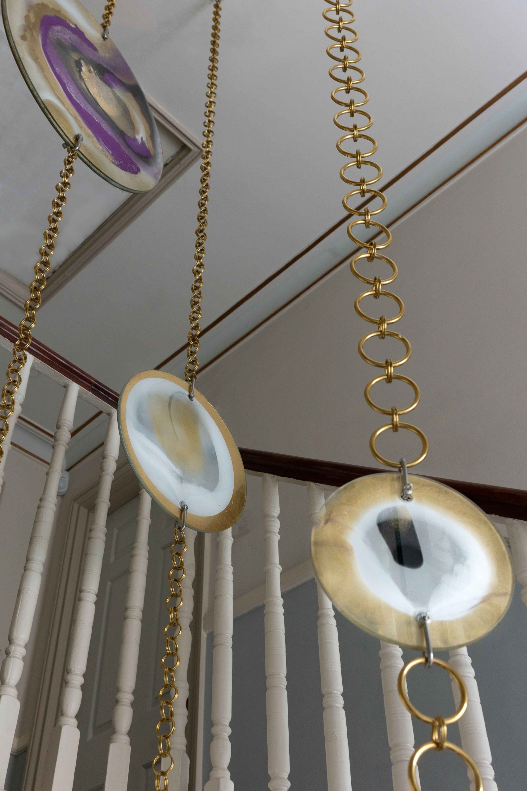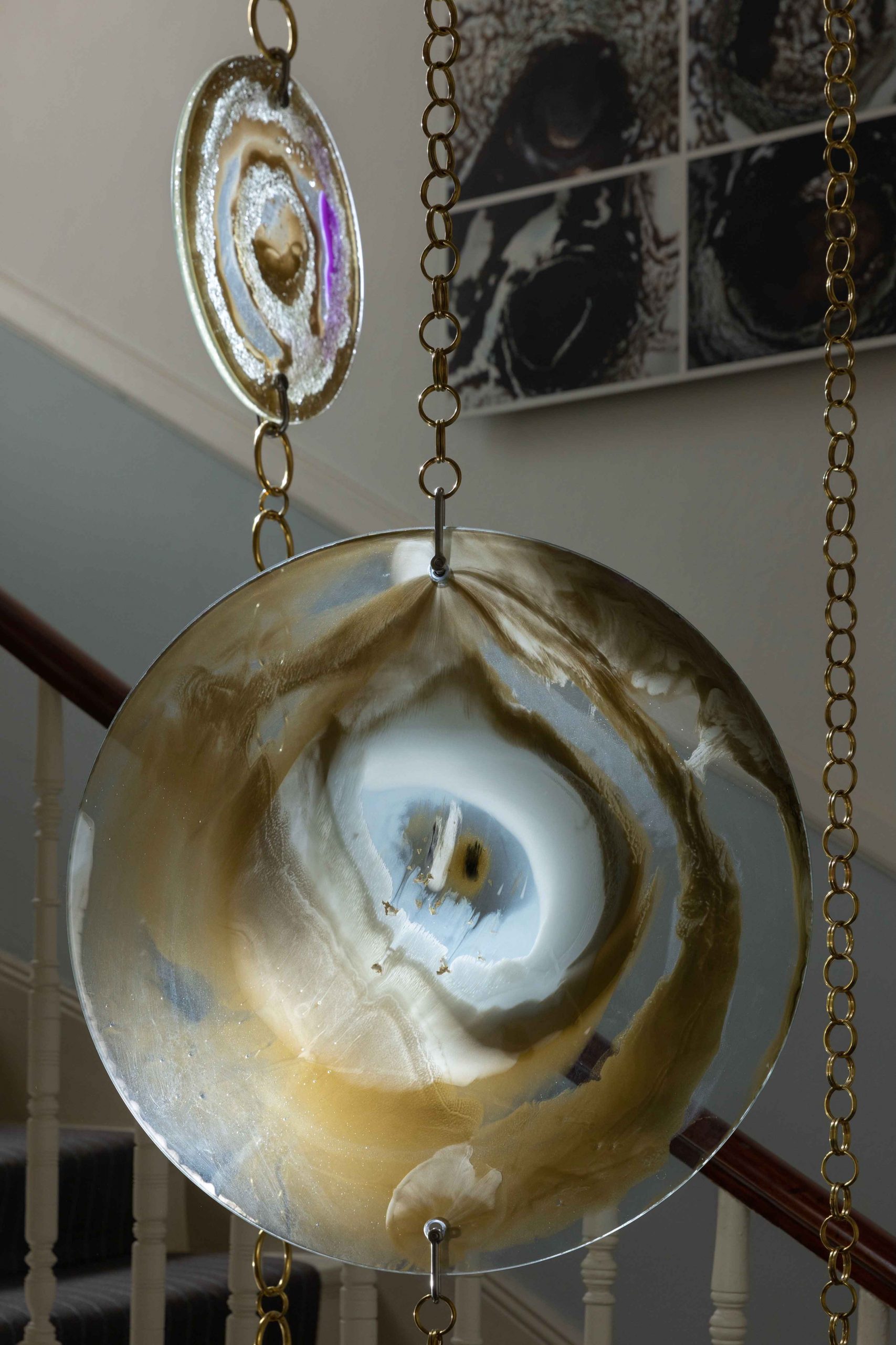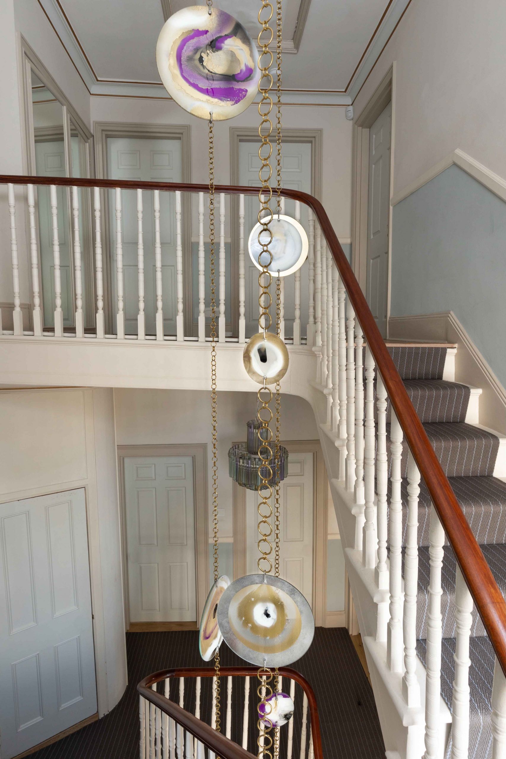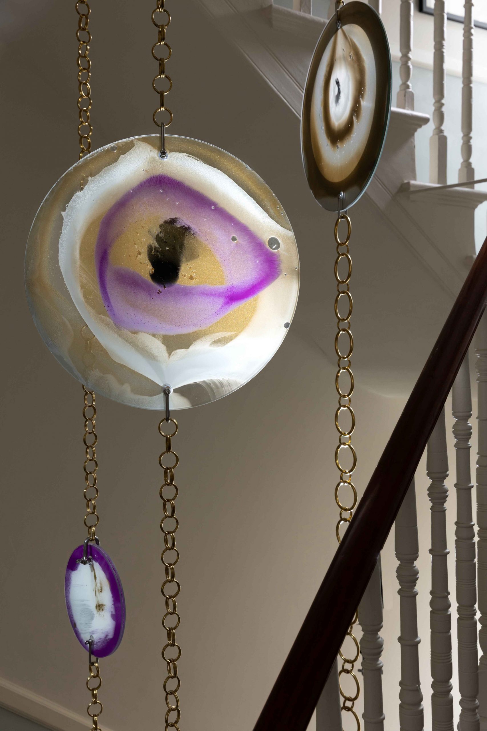 Developing from the core tenet of the Stratified Jewels as conveyors of worthy concepts, values and attitudes, the ‘Pendulum of Attachment’ is an installation of 12 circular glass pieces hung on 3 chains in a stairwell of a house in Mayfair.