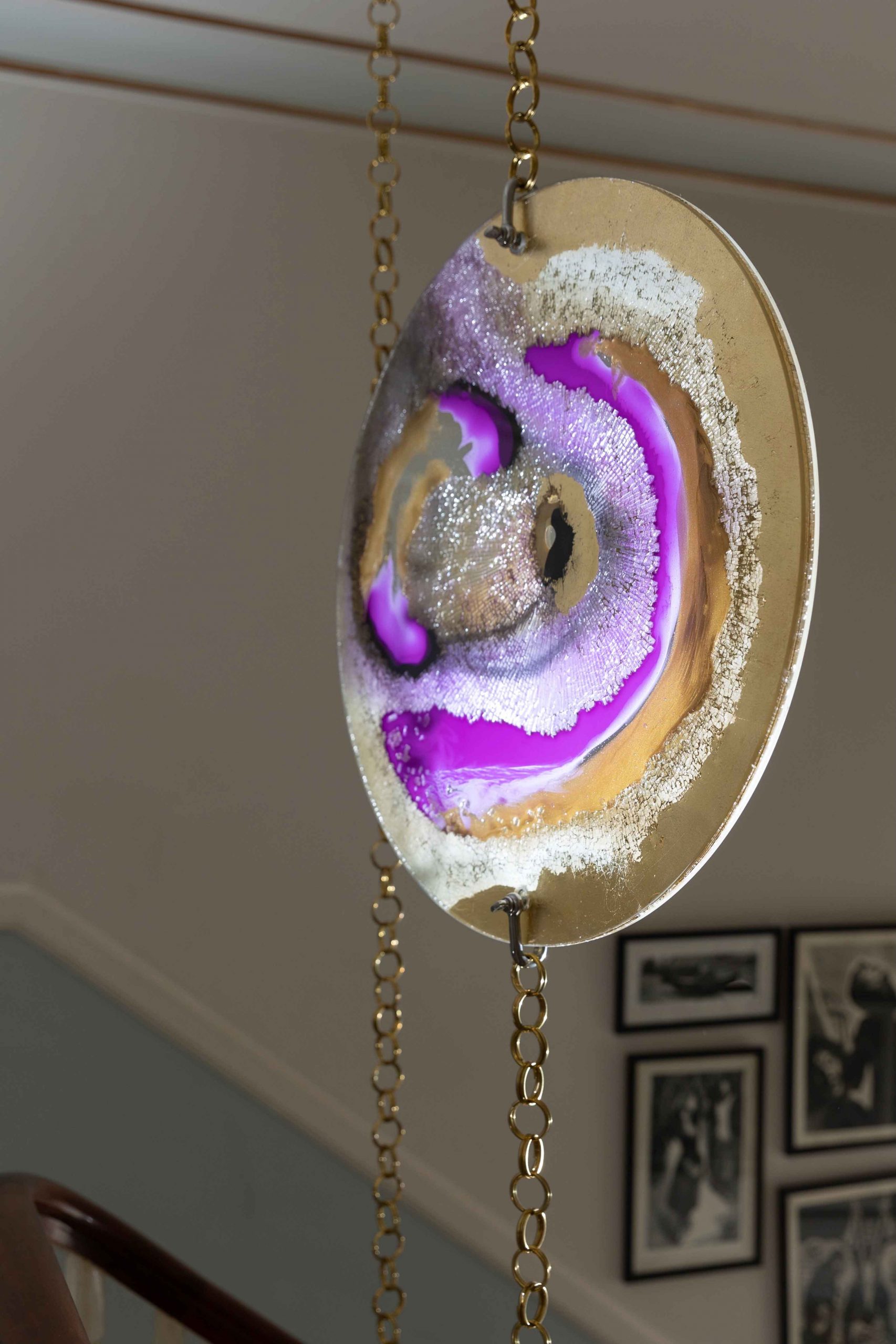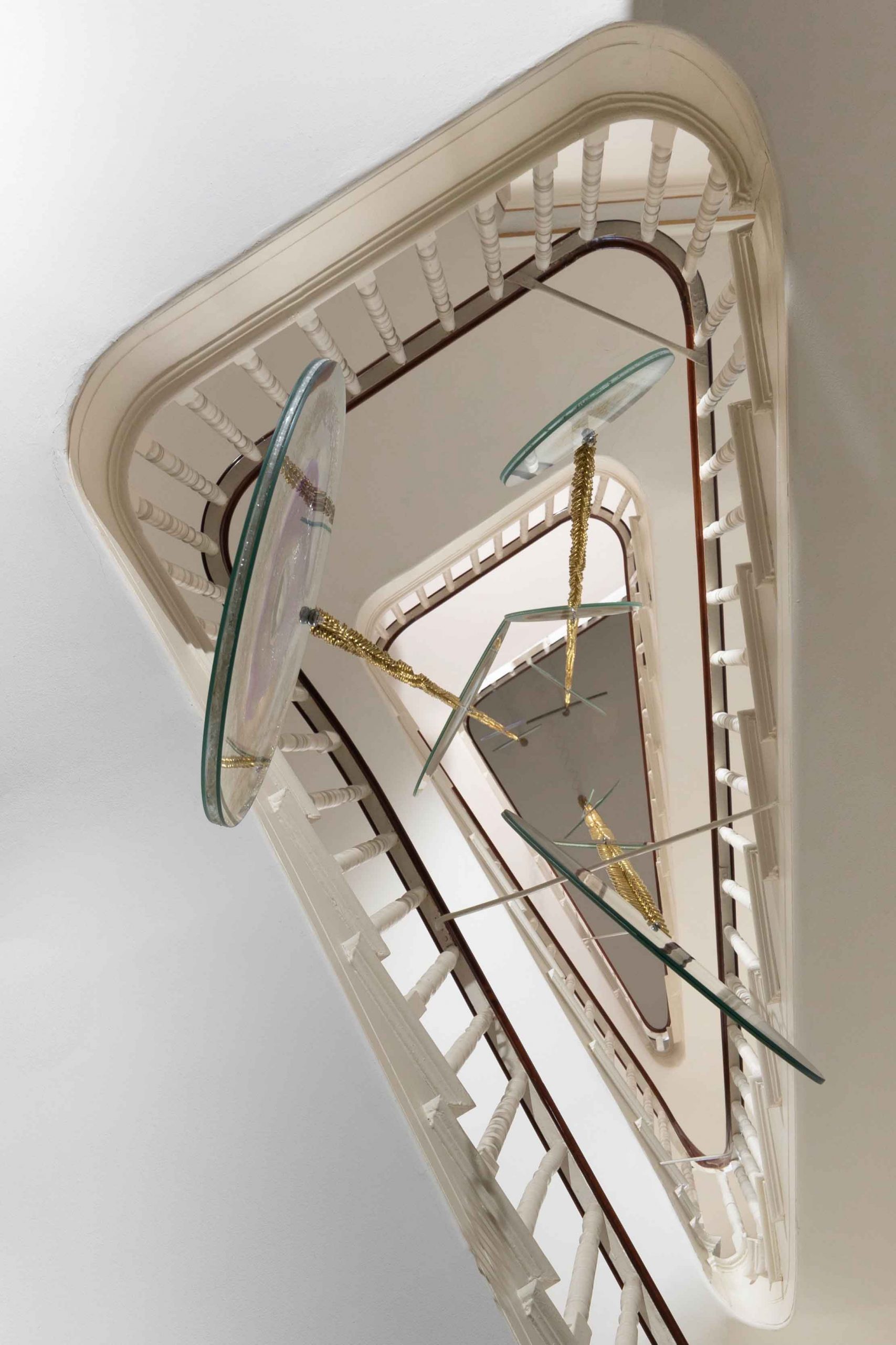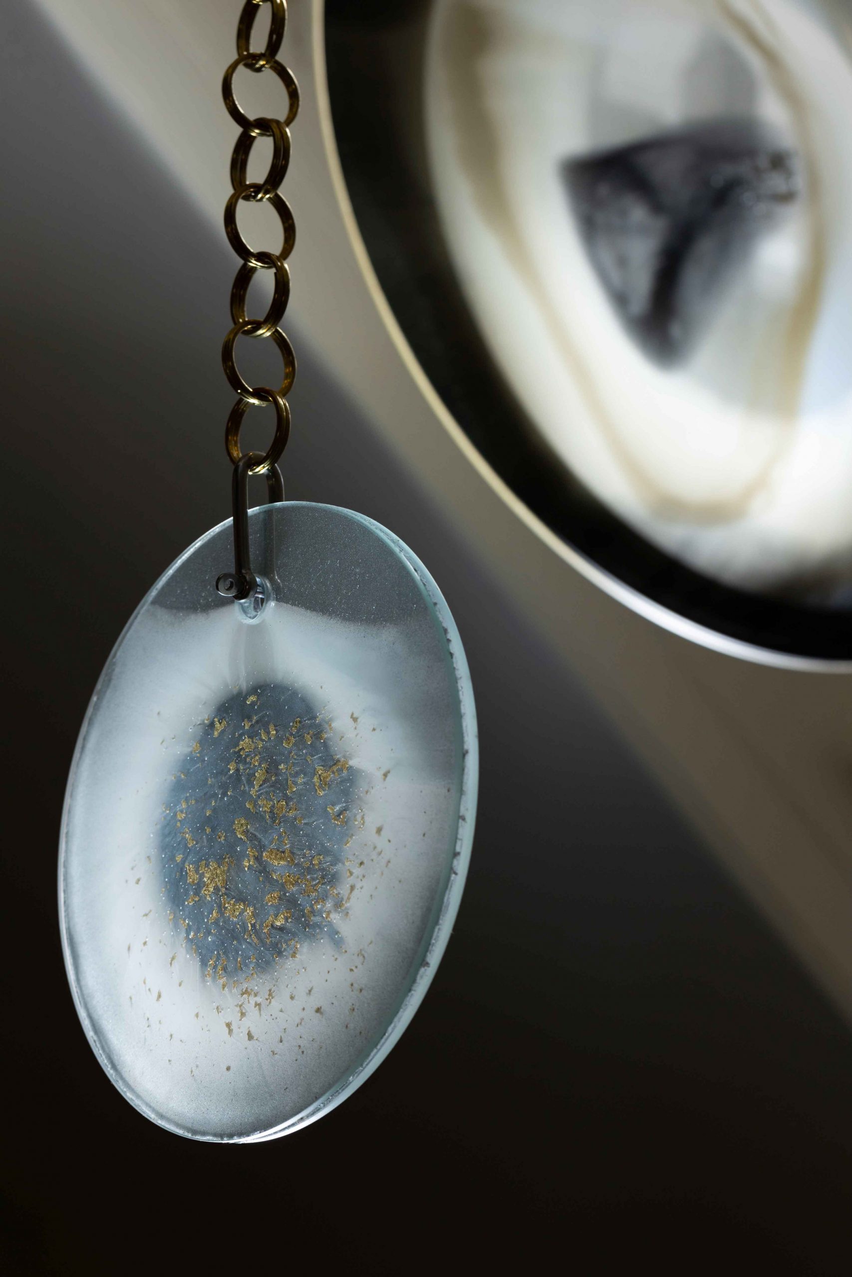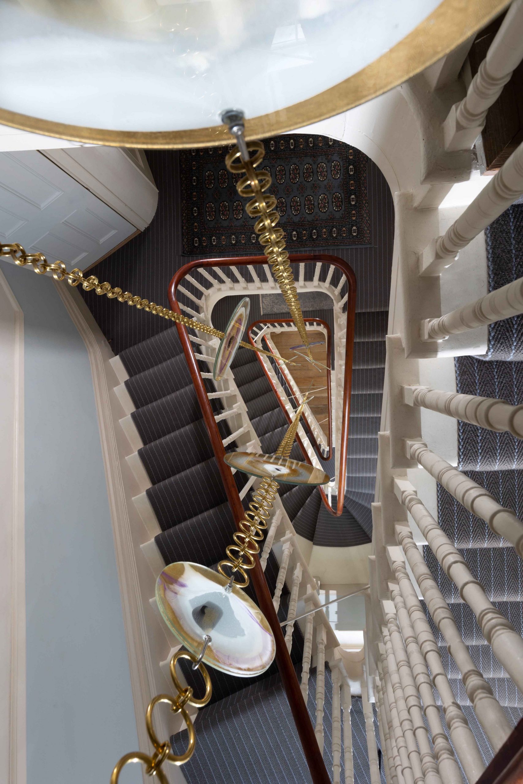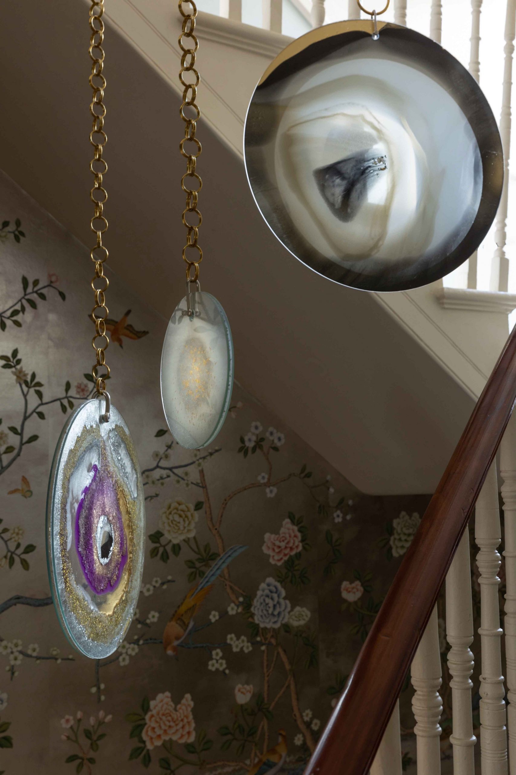 Developing from the core tenet of the Stratified Jewels as conveyors of worthy concepts, values and attitudes, the ‘Pendulum of Attachment’ is an installation of 12 circular glass pieces hung on 3 chains in a stairwell of a house in Mayfair.